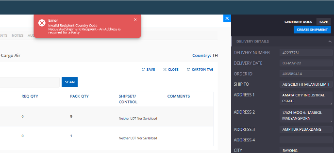 Debugging | Check the gross weight of the cartons. If the sum of weight of all cartons ends up with the value 0, then it should be changed. |